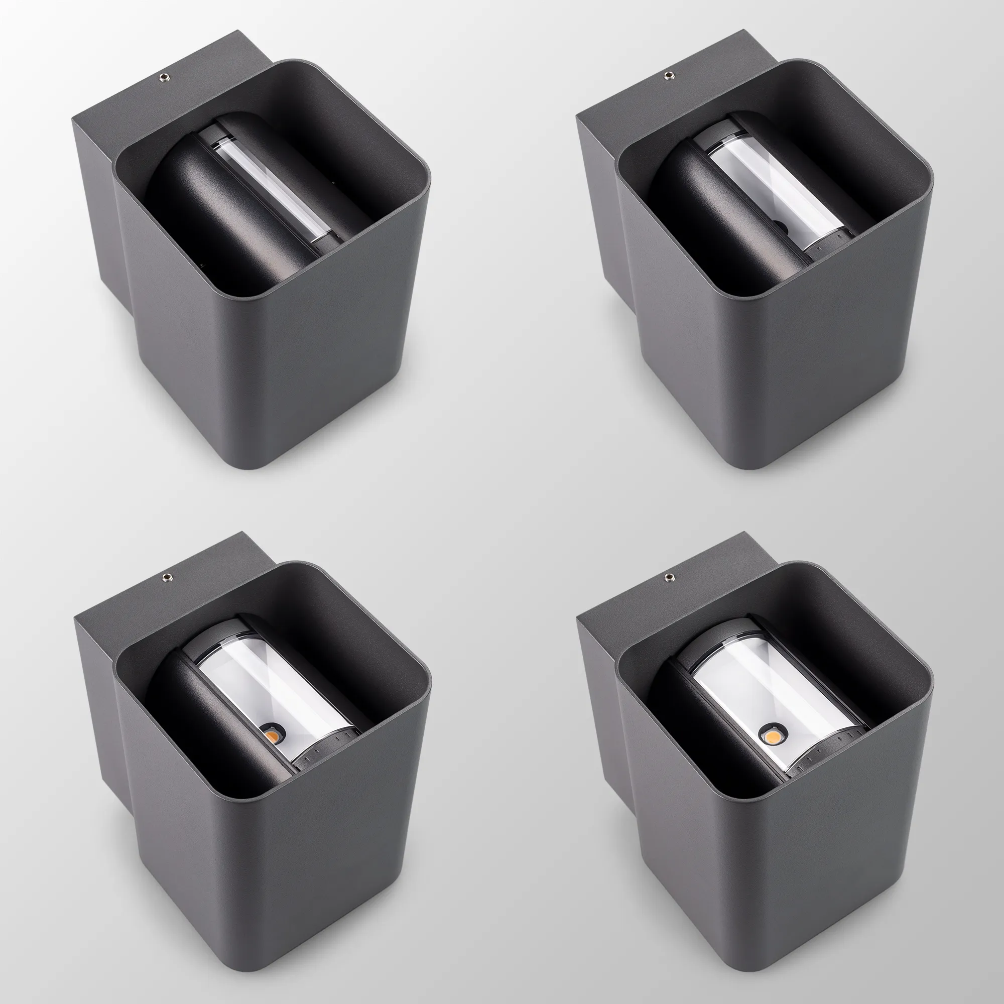 Уличный светодиодный светильник для стен, изменяемый угол освещения 0°-80°, свет вверх-вниз на 2 стороны. Цвет ТЕПЛЫЙ БЕЛЫЙ 3000К, светодиоды 2x6Вт CREE (750 лм). Влагозащищенный корпус IP54 - темно-серый (RAL7022) алюминий, экран ударопрочный PC. Питание 230В, мощность 12 Вт. Размеры ВхШхГ -138х104х129 мм.
