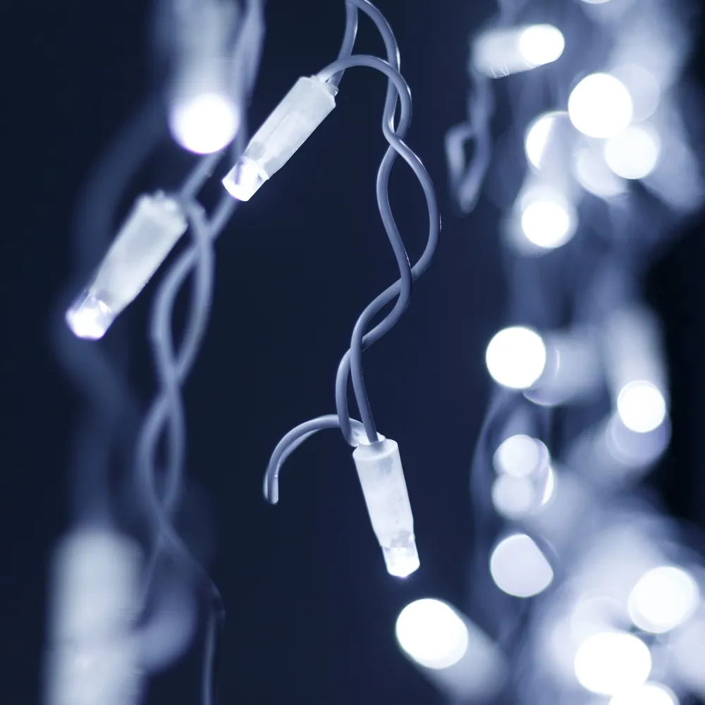Светодиодная бахрома Classic. Размер 2400x600 мм (длина 2400 мм, по длине 24 нити высотой 200/600 мм). Количество светодиодов 88 шт размером 7 мм. Цвет свечения БЕЛЫЙ (6000 К), эффект постоянного свечения с мягким световым рисунком (выпуклая молочно-белая линза). Провод белый, ПВХ. Питание 230 В, Мощность 6 Вт, защита IP65, применение на улице под навесом. Аксессуары для подключения приобретаются отдельно.