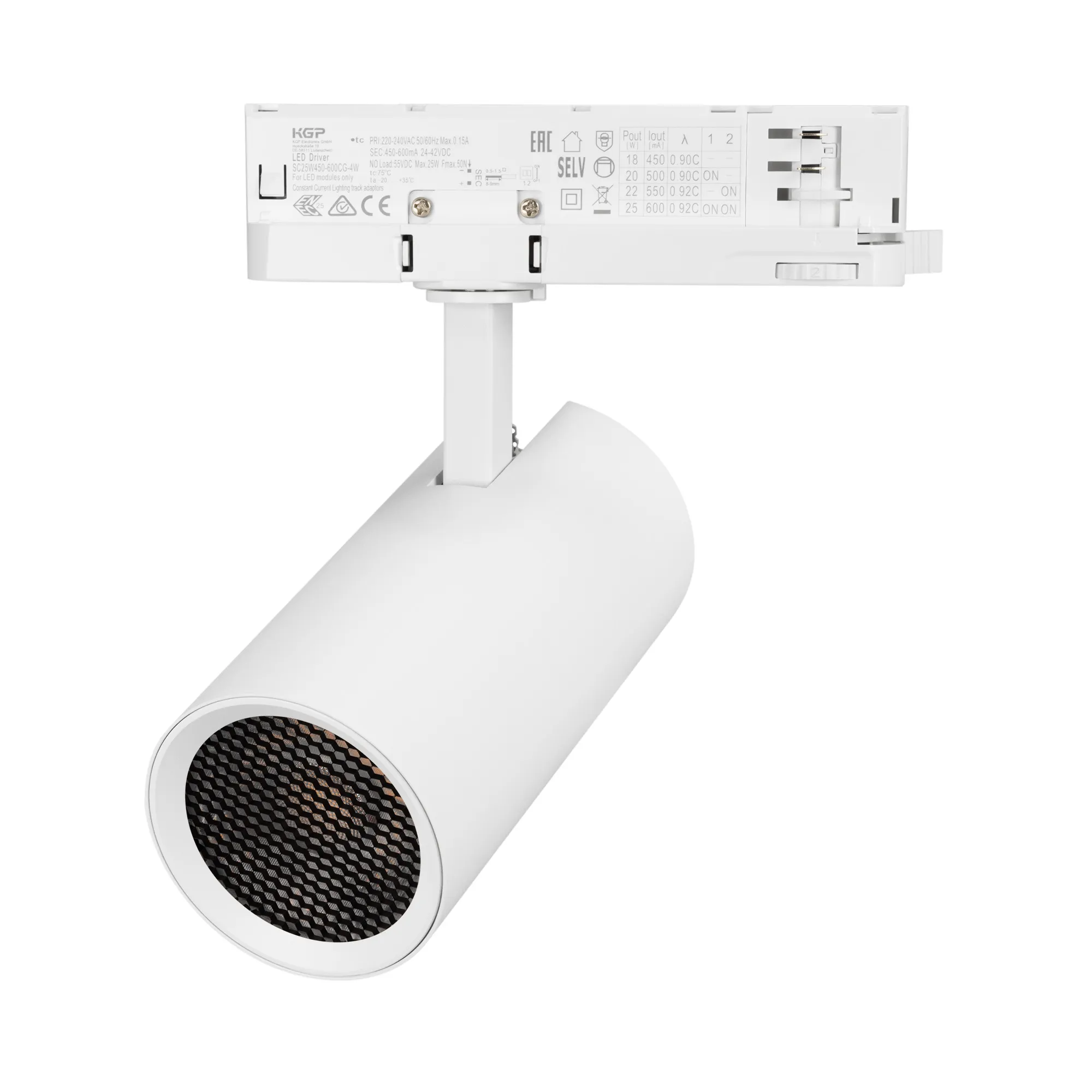 Светильник для треков/шин 4 провода. Мощность 20 Вт, св. поток без решетки honeycomb 2000 лм, 100 лм/Вт, с решеткой honeycomb 1320 лм, 66 лм/Вт, дневной 4000 K, CRI>90, угол 36°, напряжение питания 230 В. Белый круглый корпус из алюминия, материал линзы PMMA, степень защиты IP20. Размер: диаметр 74 мм, длина световой части 154 мм. Монтаж на трек 3-фазный. Драйвер встроенный 24-42 В, 500мА., пульсация <5%