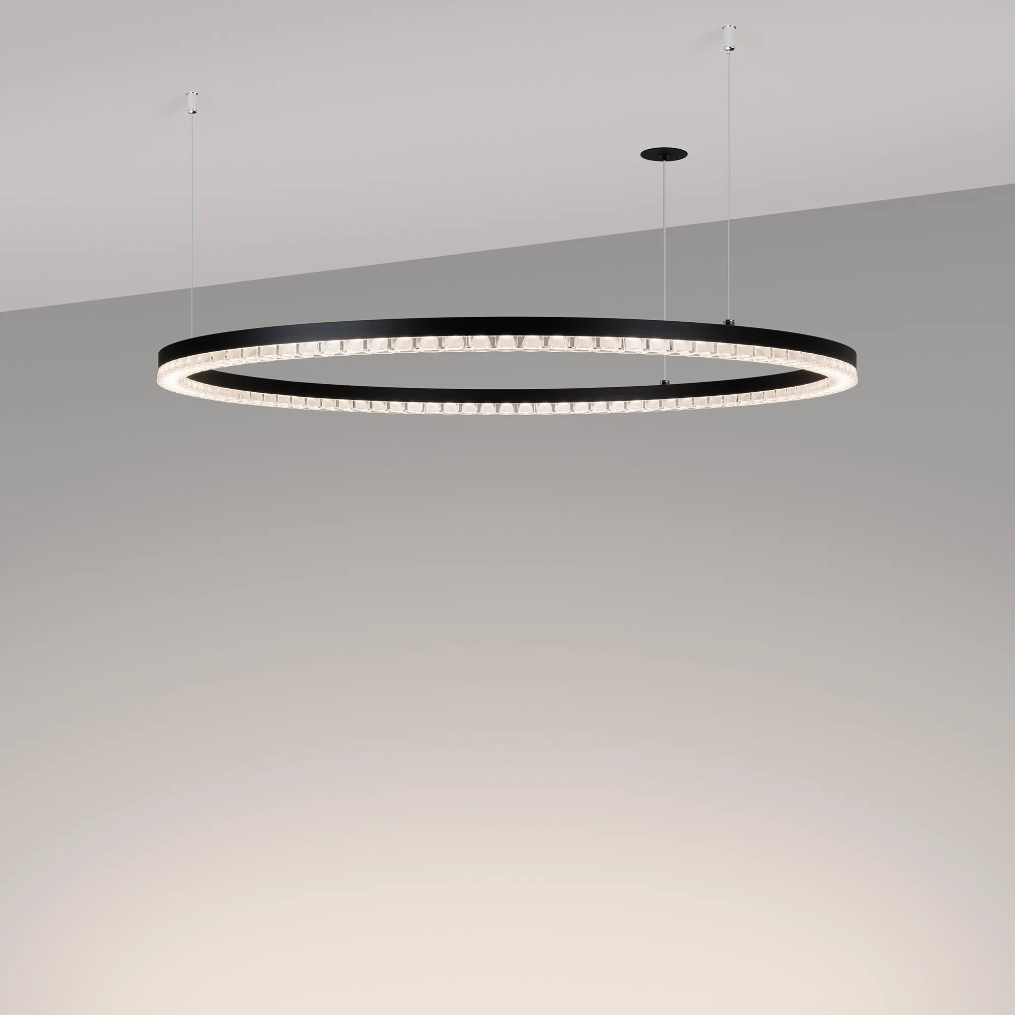 Подвесной светильник. Мощность 40 Вт, св. поток 3460 лм, 80-95 лм/Вт, дневной белый 4000K, CRI>90, угол 45°, напряжение питания 230 В. Черный круглый корпус из алюминия, экран PMMA, степень защиты IP20. Размер: диаметр 850 мм, высота 34мм, ширина профиля 30 мм, размер чаши: диаметр 65 мм, высота 26 мм. Монтаж подвесной, длина подвеса 1200 мм, тип чаши встраиваемый, диаметр установочного отверстия чаши 60 мм. Драйвер 27-38 В, 1050мА. Пульсация <0,3 %.